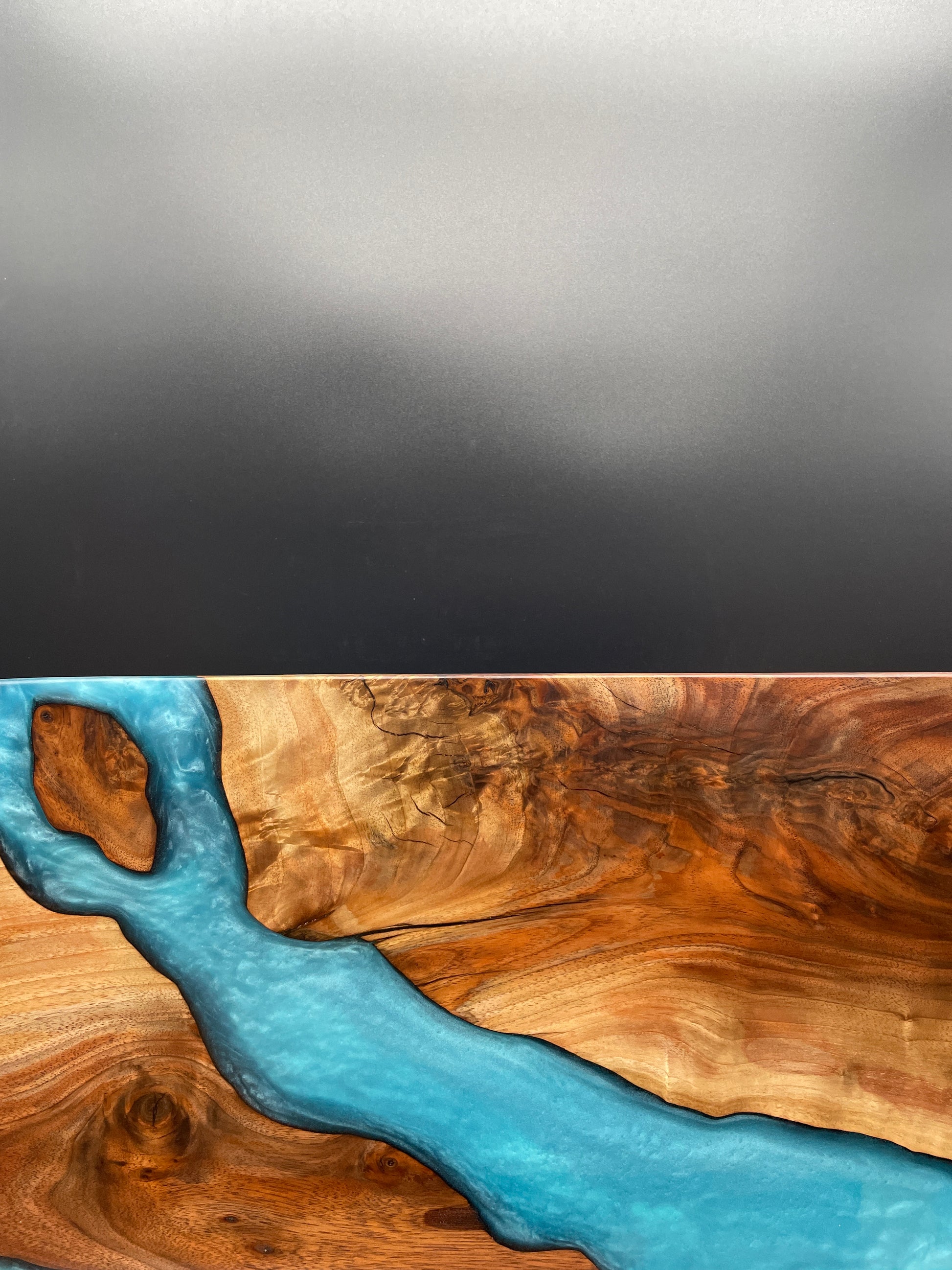 We pour as much as the crest of the river will allow and let it cure. Typically, the resin infiltrates and absorbs into the wood, and we have to watch it, not only for leaks but to top it up as needed. Once we're confident, we let it be. With the amounts of epoxy we use, it takes about 3 days to cure.