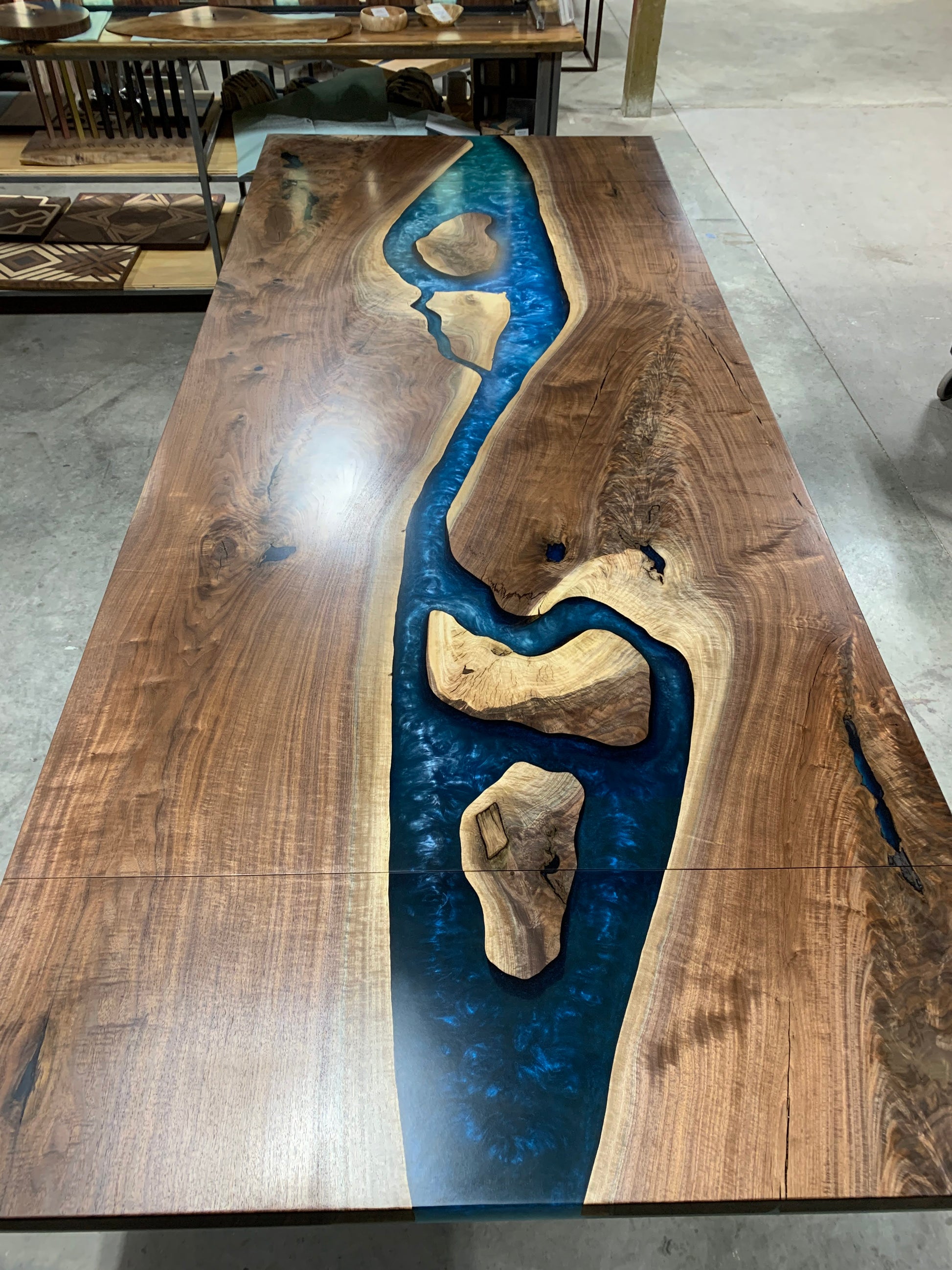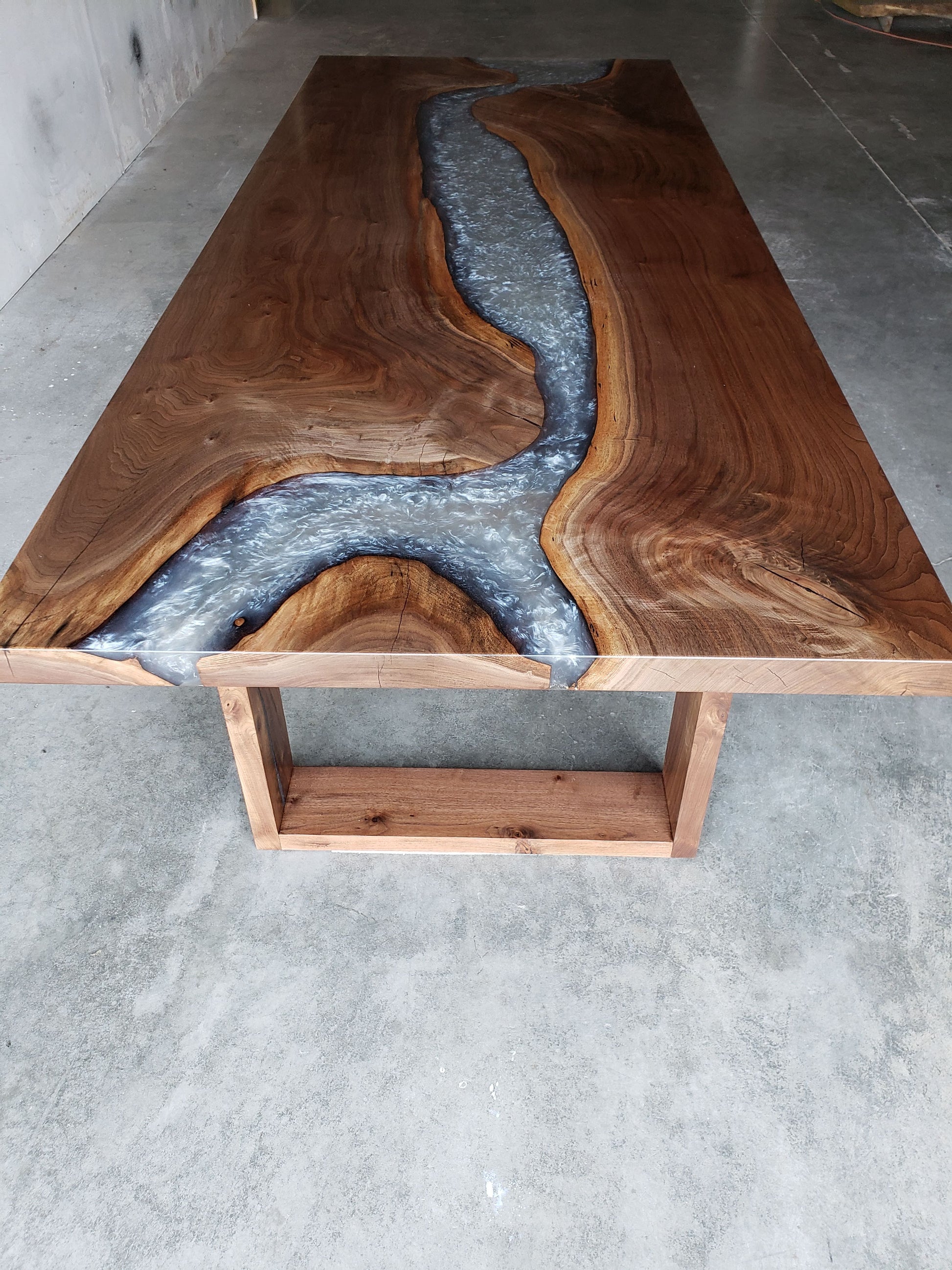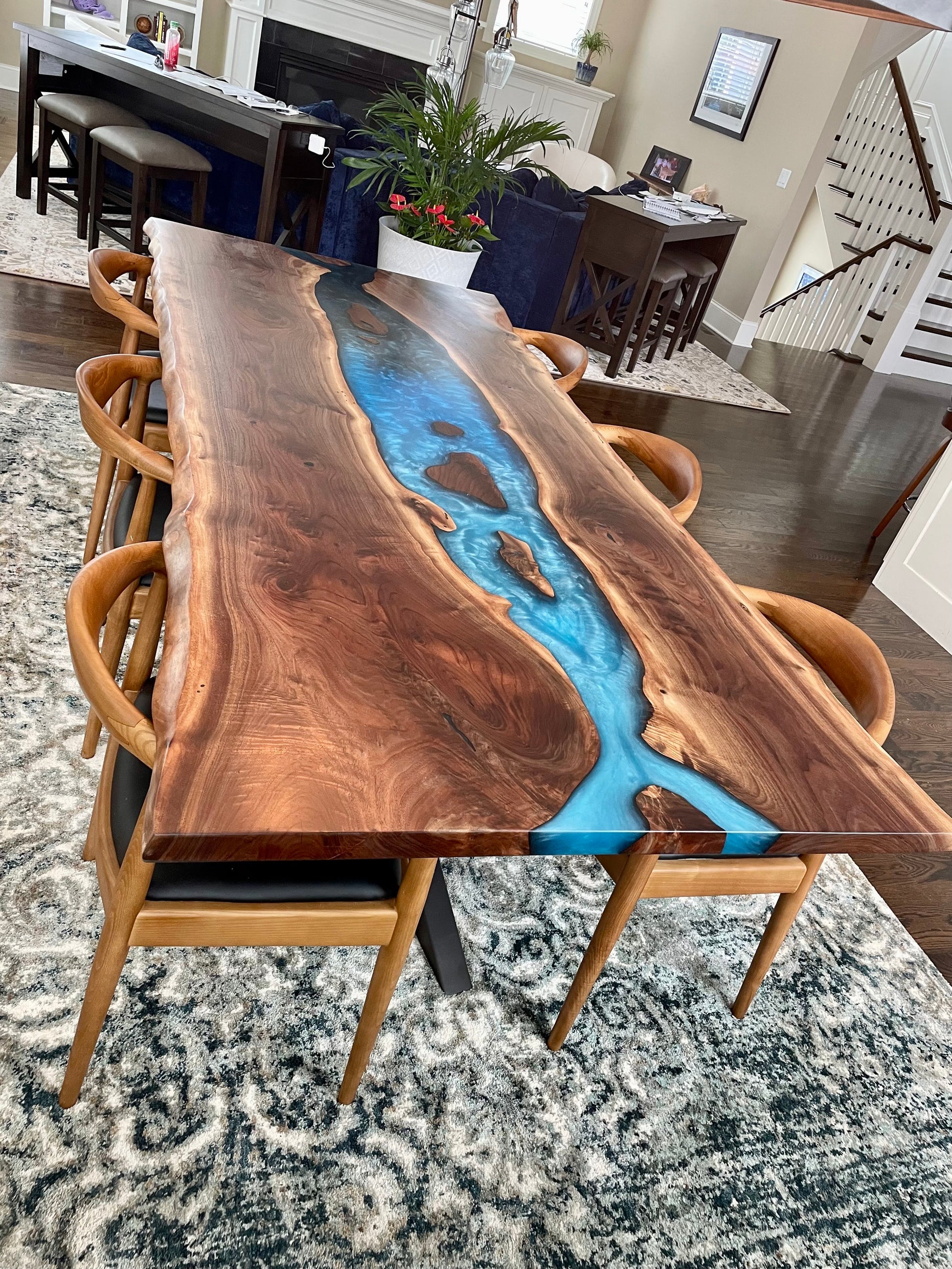 Our Signature Black Walnut dining table with an epoxy resin river down the center of the table starts at a cost of $5450 with dimensions of 72"x36". It comes with an epoxy resin river of your desired color or color-blend and straight cut outer edges on all 4 sides. Rectangular metal legs in your choice of color are included in the price and are made of 3"x1" tube steel. Table height is typically 30" but can be modified upon request. As the table size increases, larger leg material costs are added to the price.