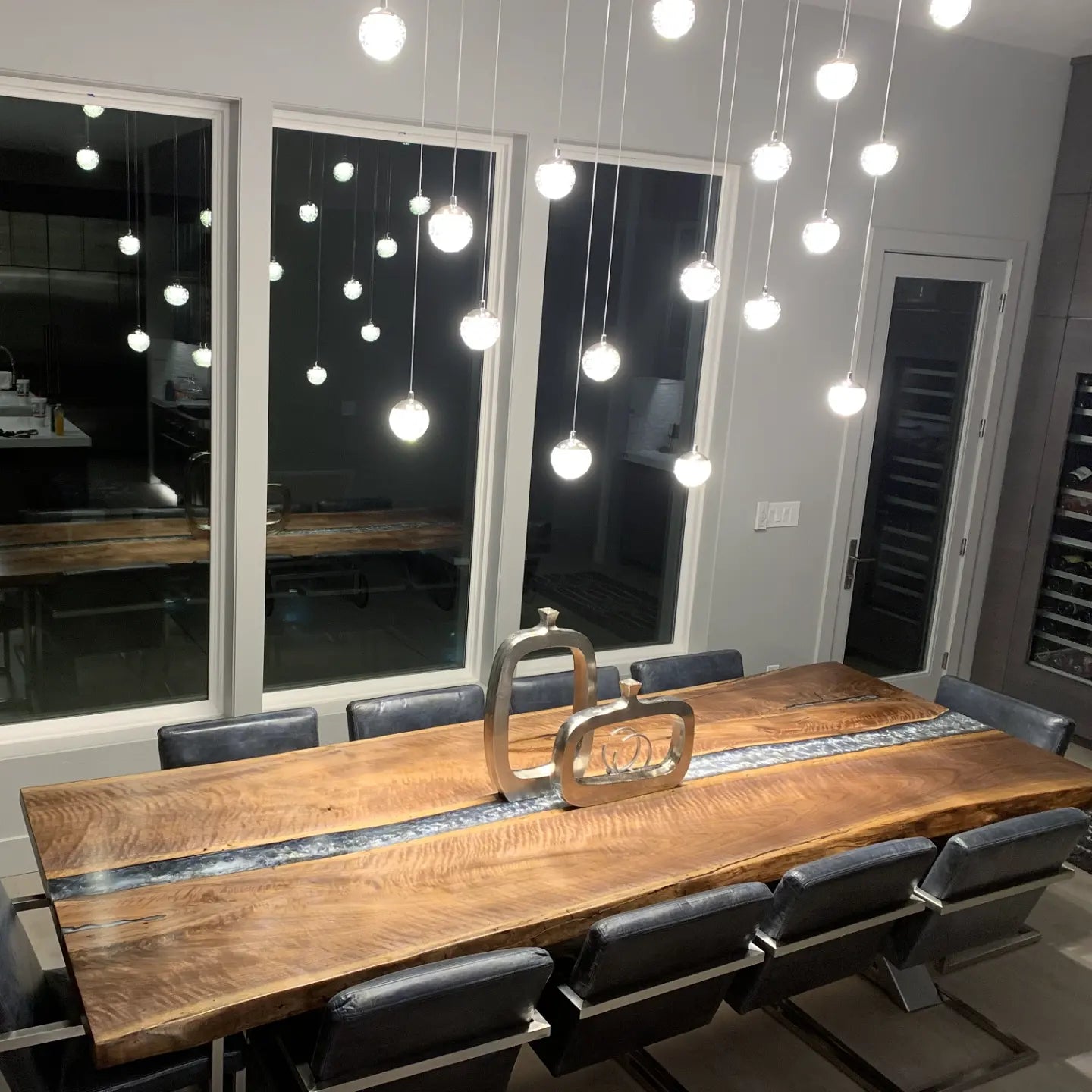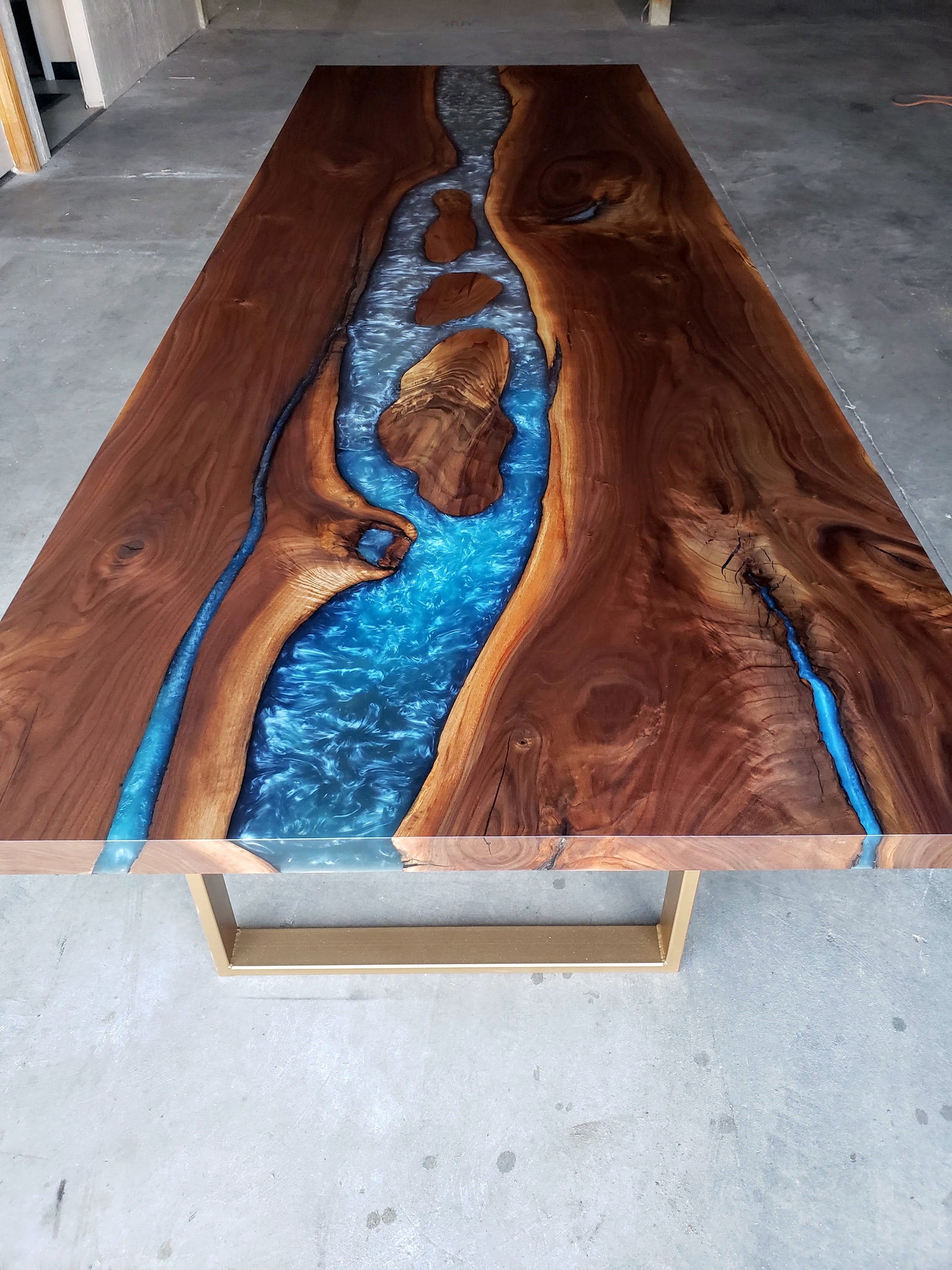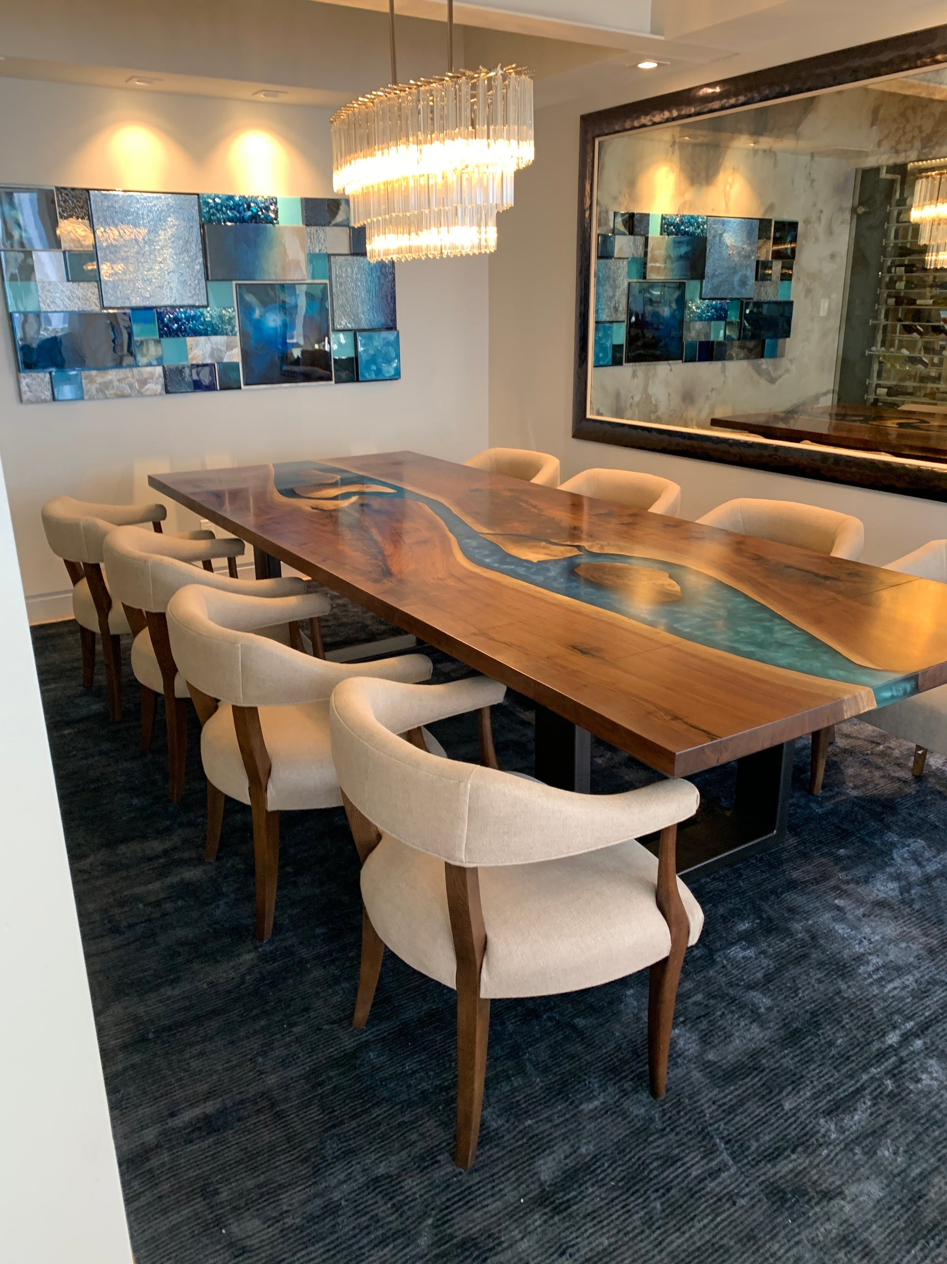 Our Signature Black Walnut dining table with an epoxy resin river down the center of the table starts at a cost of $5450 with dimensions of 72"x36". It comes with an epoxy resin river of your desired color or color-blend and straight cut outer edges on all 4 sides. Rectangular metal legs in your choice of color are included in the price and are made of 3"x1" tube steel. Table height is typically 30" but can be modified upon request. As the table size increases, larger leg material costs are added to the price.