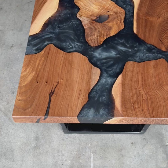 Locally sourced premium American elm shows off its deep swirling grain patterns while giving way to pockets of platinum epoxy fills and streams.