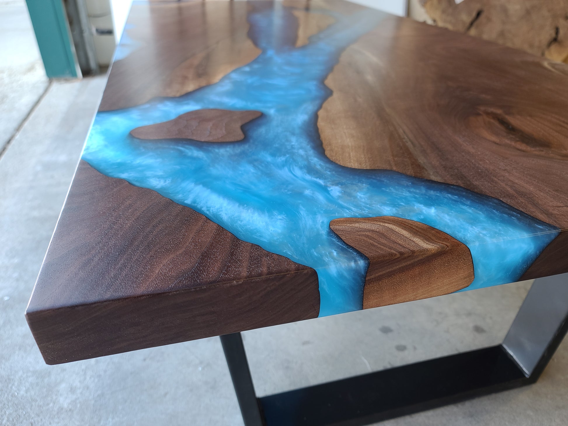 We pour as much as the crest of the river will allow and let it cure. Typically, the resin infiltrates and absorbs into the wood, and we have to watch it, not only for leaks but to top it up as needed. Once we're confident, we let it be. With the amounts of epoxy we use, it takes about 3 days to cure.