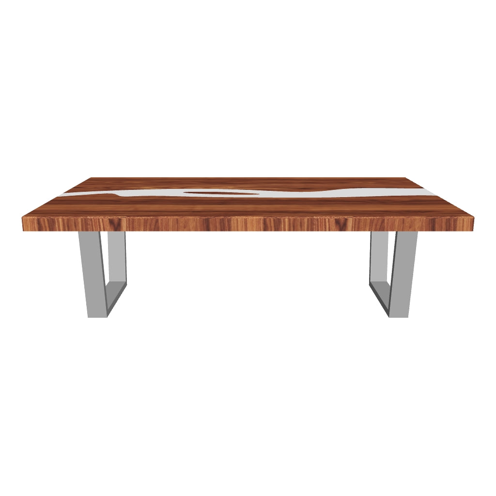 Alongside this production queue, we outsource our legs from local welders. The designs are fabricated and painted as needed, then dropped off at our shop. We align the bolts so that they anchor in the wood and are not seen in the resin, then install the legs securely using as many bolts as will securely hold the table in place. Large or heavy pieces have additional reinforcement to keep the table from bowing, including rails or even a center leg.