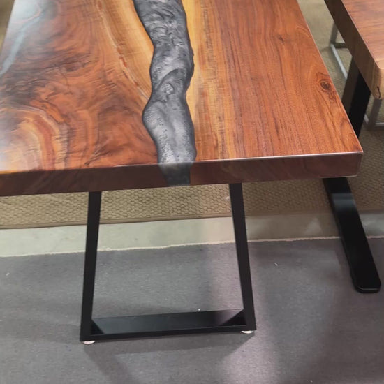 Alongside this production queue, we outsource our legs from local welders. The designs are fabricated and painted as needed, then dropped off at our shop. We align the bolts so that they anchor in the wood and are not seen in the resin, then install the legs securely using as many bolts as will securely hold the table in place. Large or heavy pieces have additional reinforcement to keep the table from bowing, including rails or even a center leg.