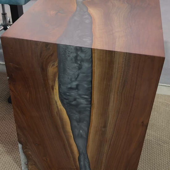 We pour as much as the crest of the river will allow and let it cure. Typically, the resin infiltrates and absorbs into the wood, and we have to watch it, not only for leaks but to top it up as needed. Once we're confident, we let it be. With the amounts of epoxy we use, it takes about 3 days to cure.