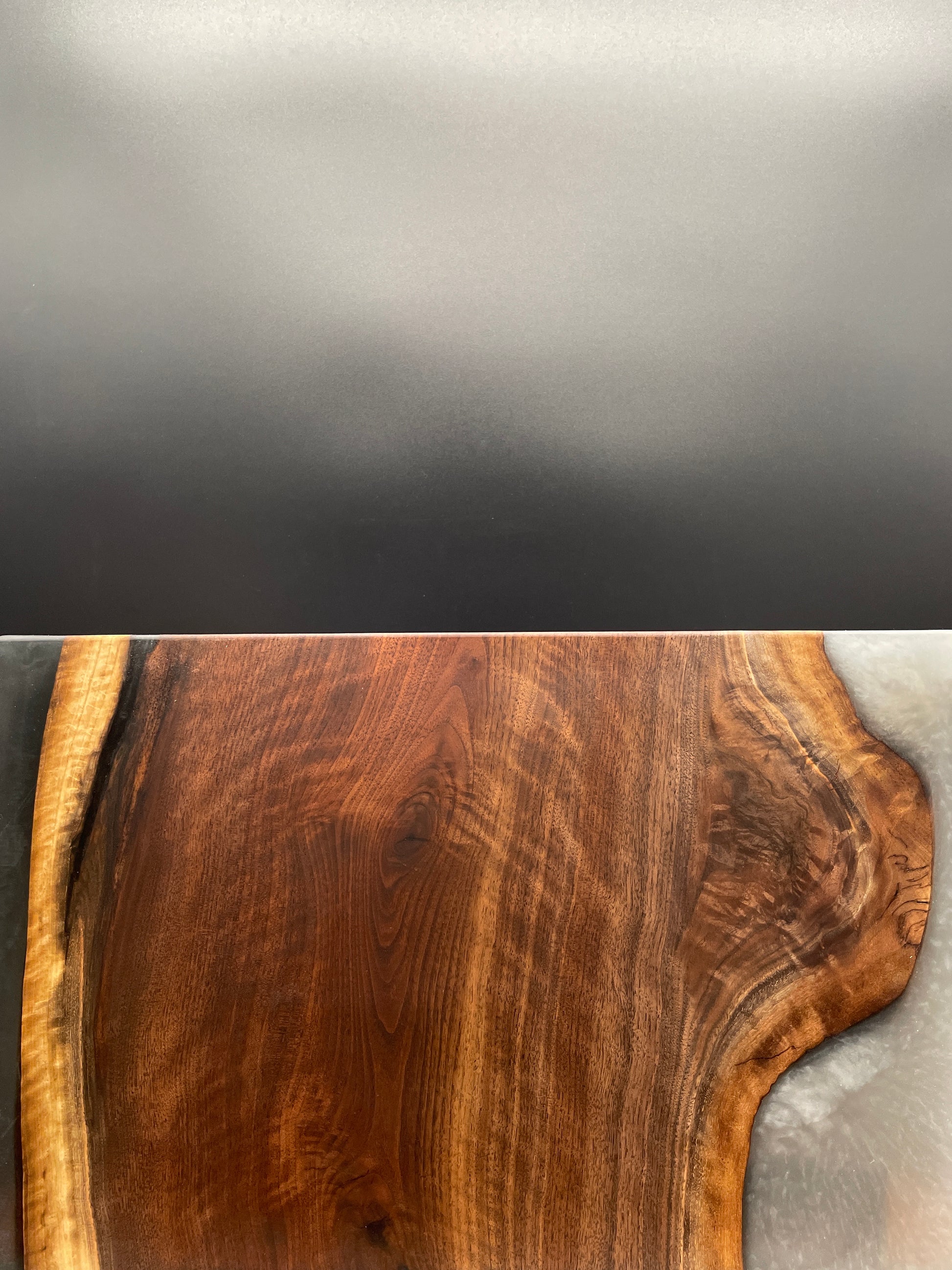 Once a slab is selected for use, the bark is removed as it's extremely difficult to work with. It is then laid out and designs are drawn an proposed for a layout. Some slabs are cut and the live edges become the outline of the river, but the design is always unique and wood can be oriented every which way to make the perfect piece come together.