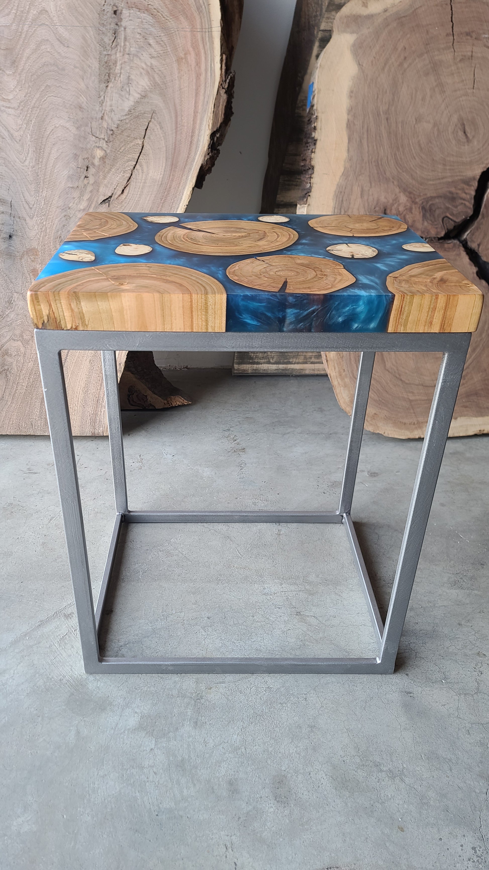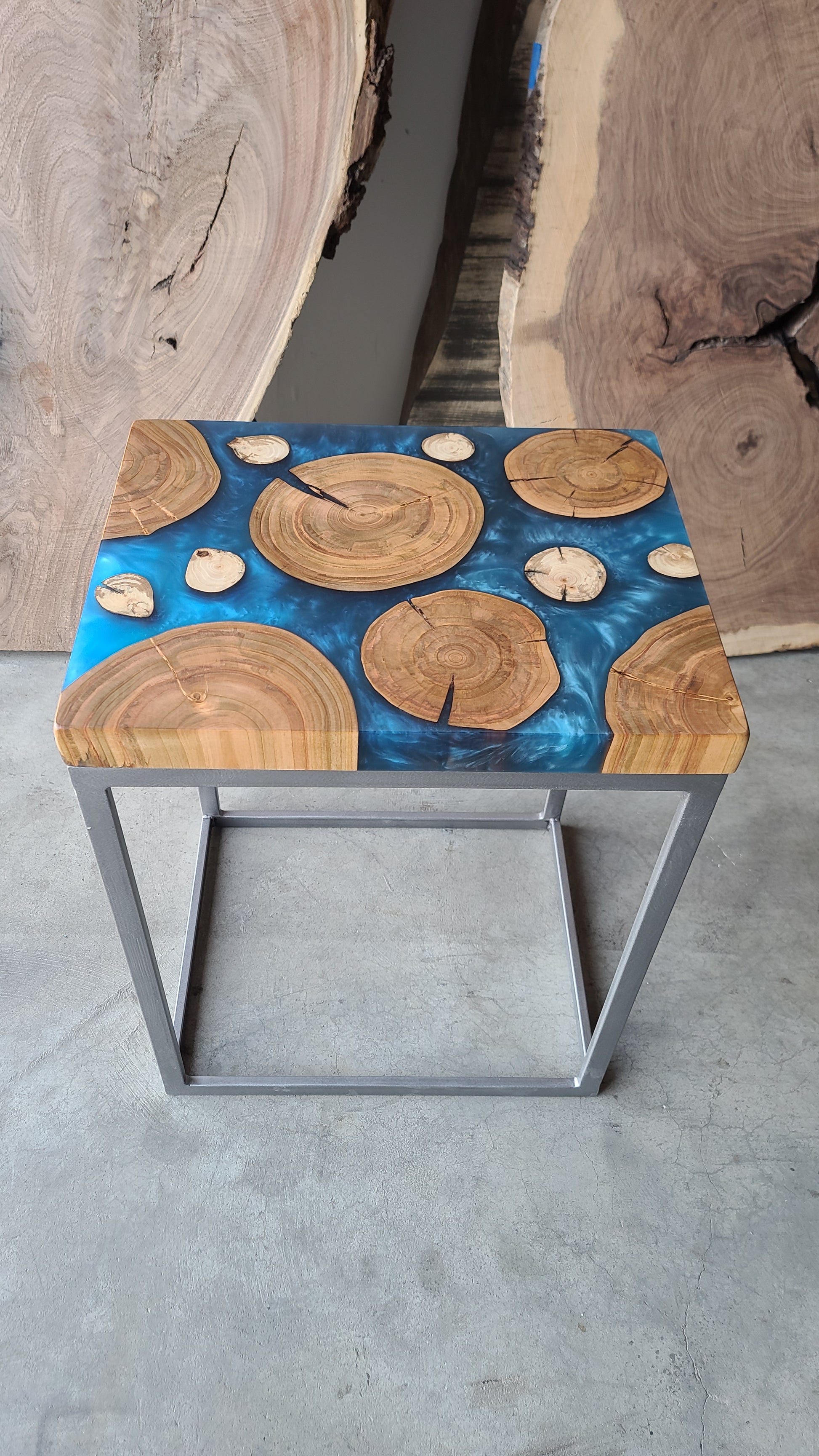 Artistically designed using various sized cherry wood cookies (or rounds), this gorgeous side table brings a lot of style and beauty to what is normally a simple furniture piece. Liven up your space with the beautiful blues in the epoxy and see something new in the table top every time you look at it. Enjoyment for many years as you set a glass of wine or bubbly on the table during a dinner party or family gathering.