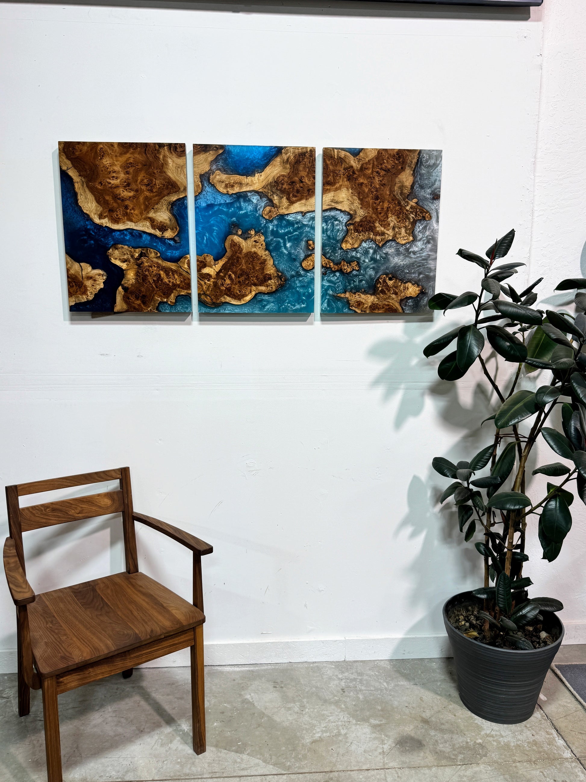 Once a slab is selected for use, the bark is removed as it's extremely difficult to work with. It is then laid out and designs are drawn an proposed for a layout. Some slabs are cut and the live edges become the outline of the river, but the design is always unique and wood can be oriented every which way to make the perfect piece come together.