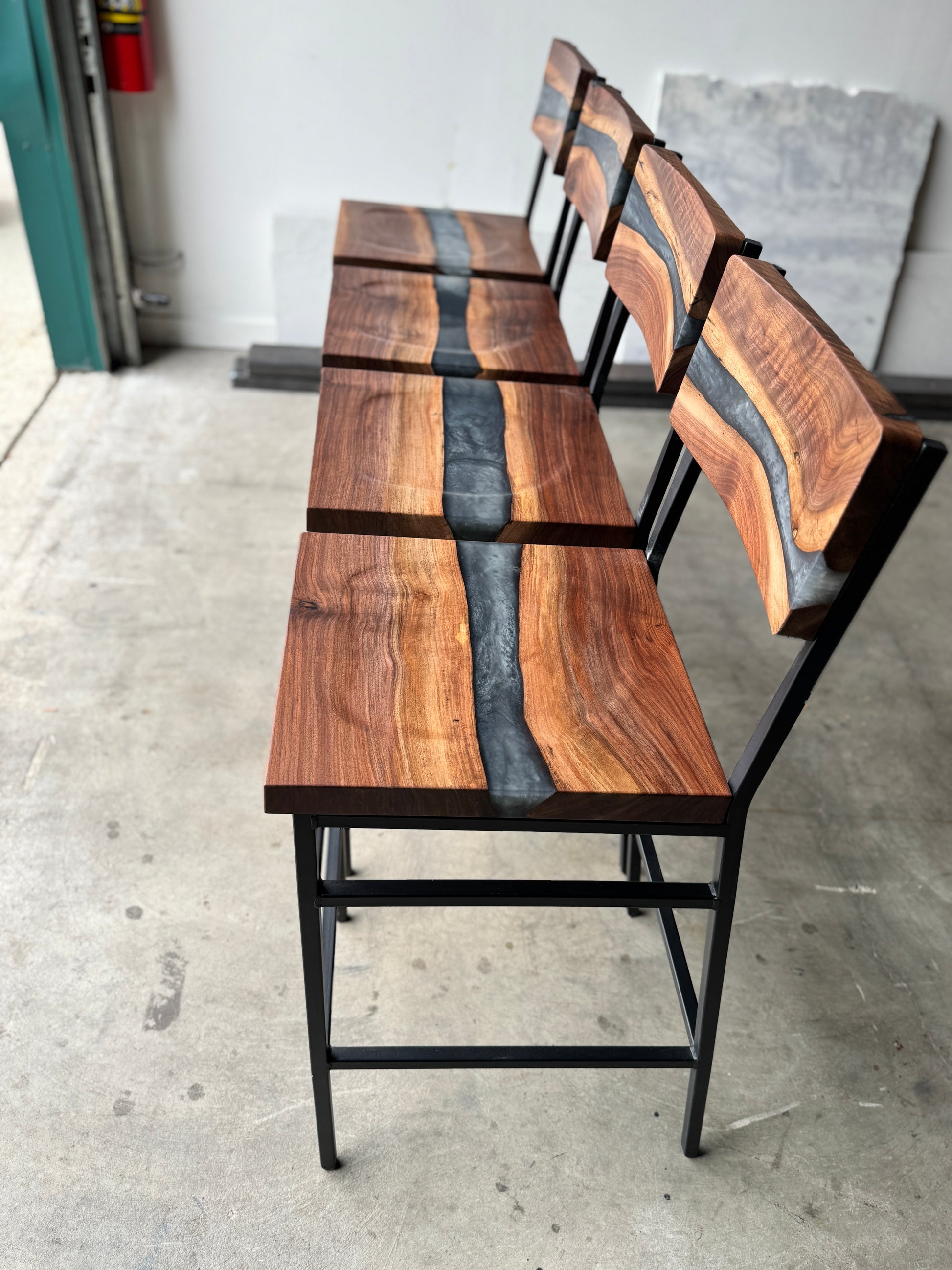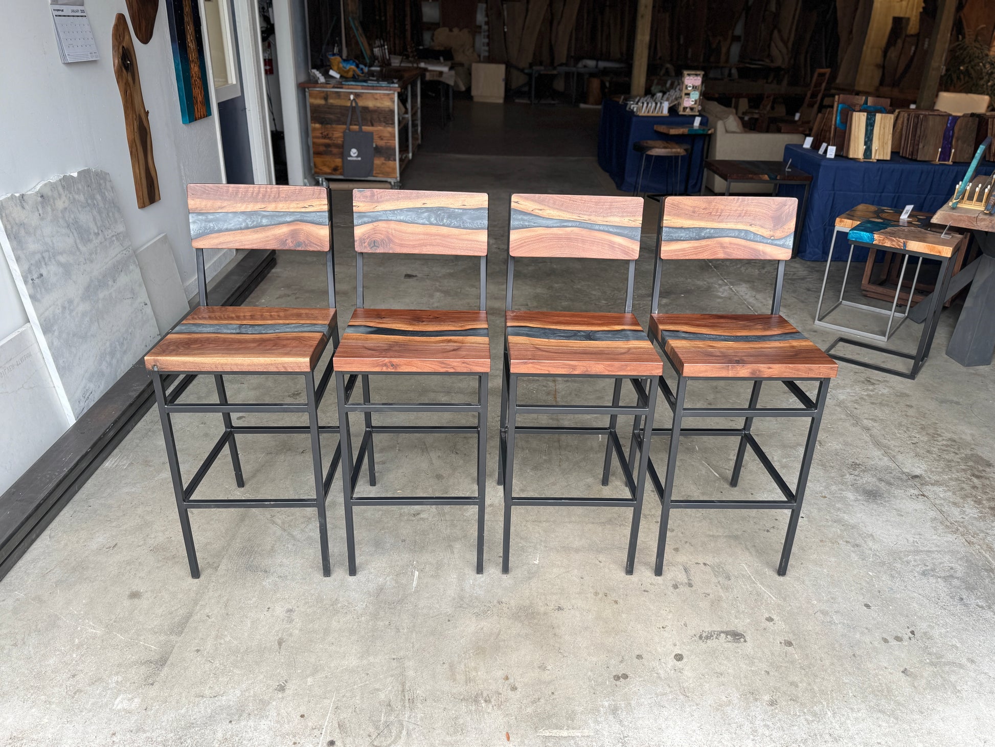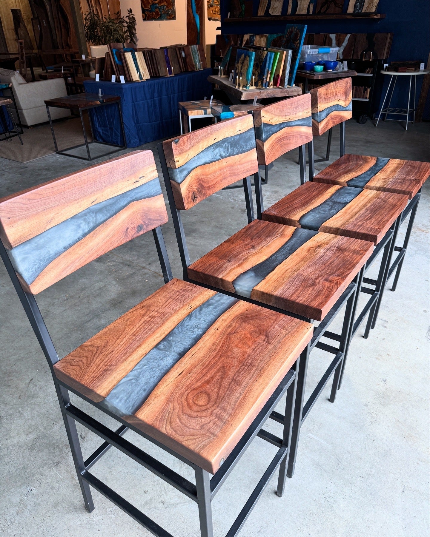 Alongside this production queue, we outsource our legs from local welders. The designs are fabricated and painted as needed, then dropped off at our shop. We align the bolts so that they anchor in the wood and are not seen in the resin, then install the legs securely using as many bolts as will securely hold the table in place. Large or heavy pieces have additional reinforcement to keep the table from bowing, including rails or even a center leg.