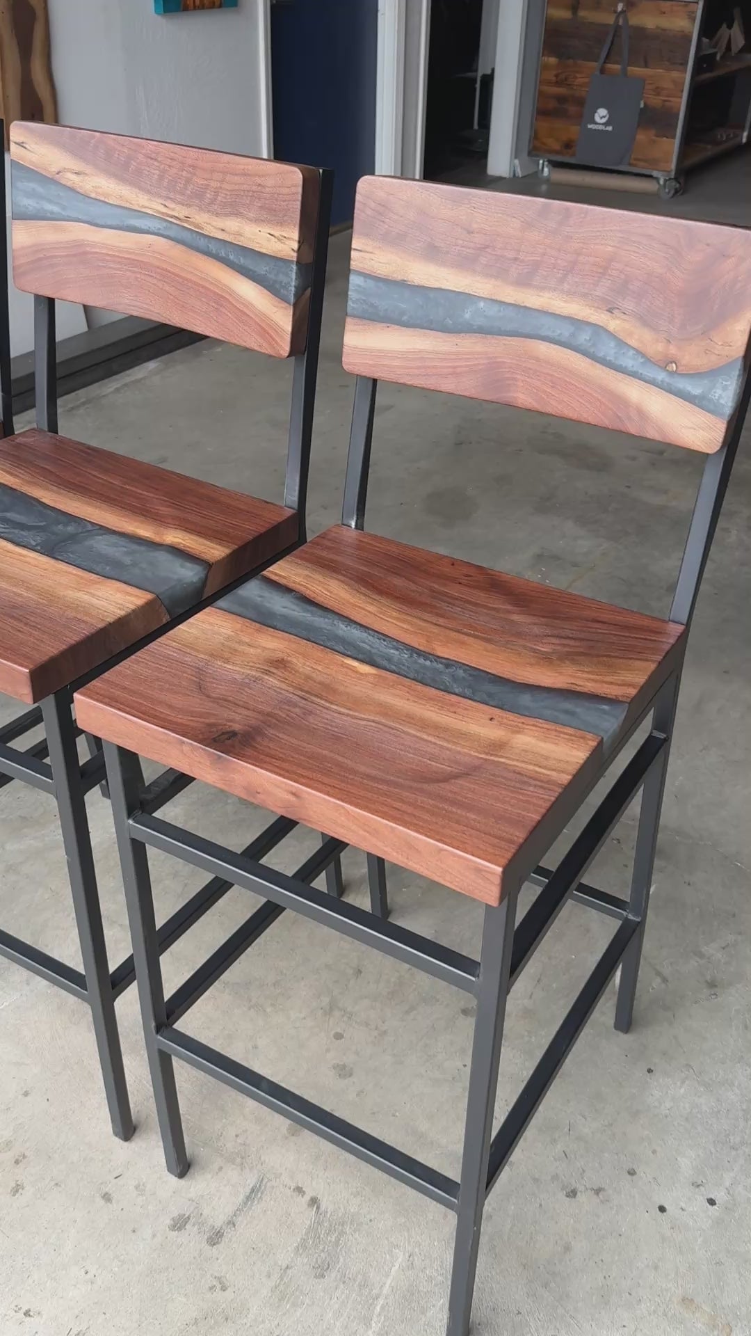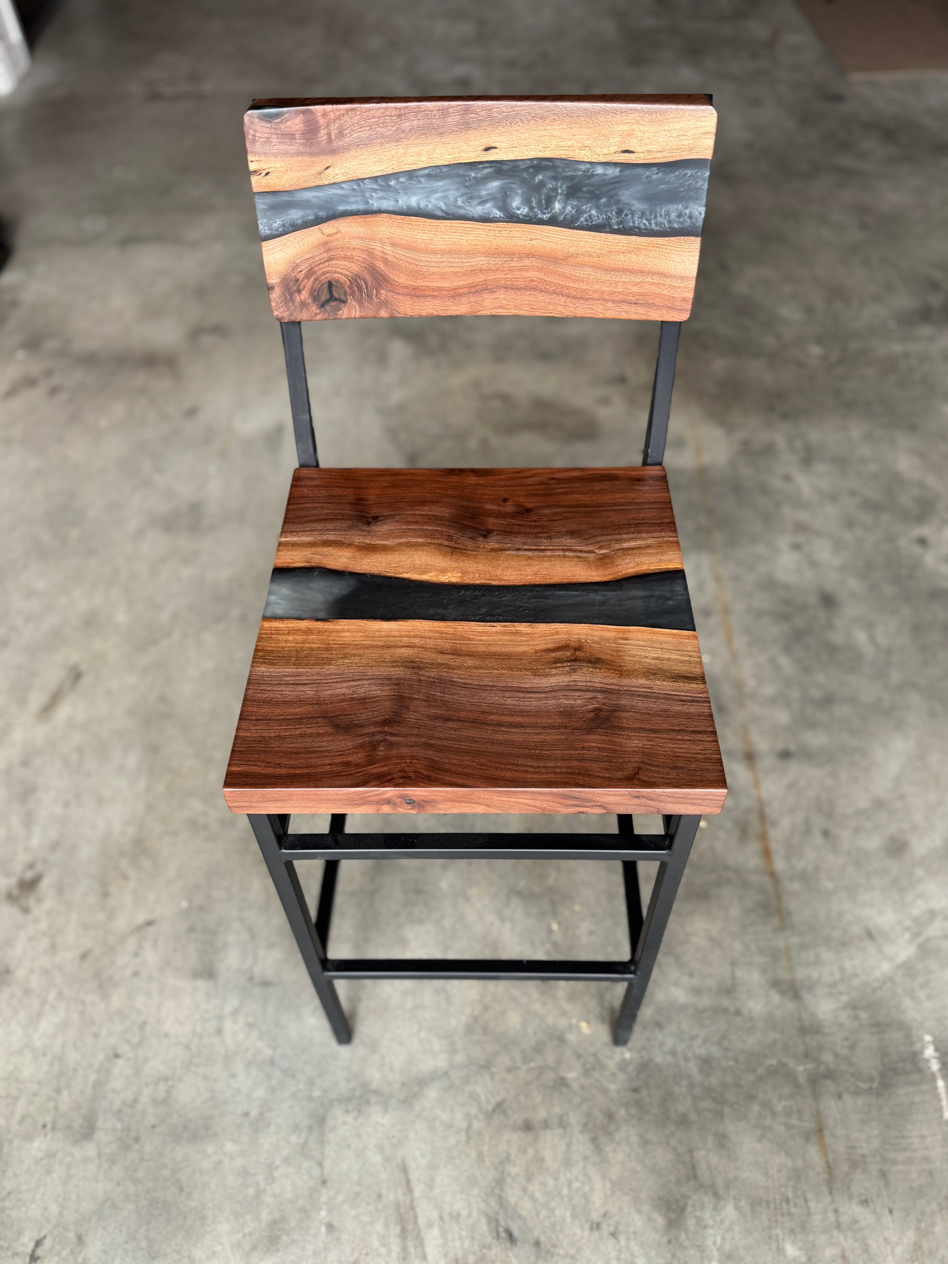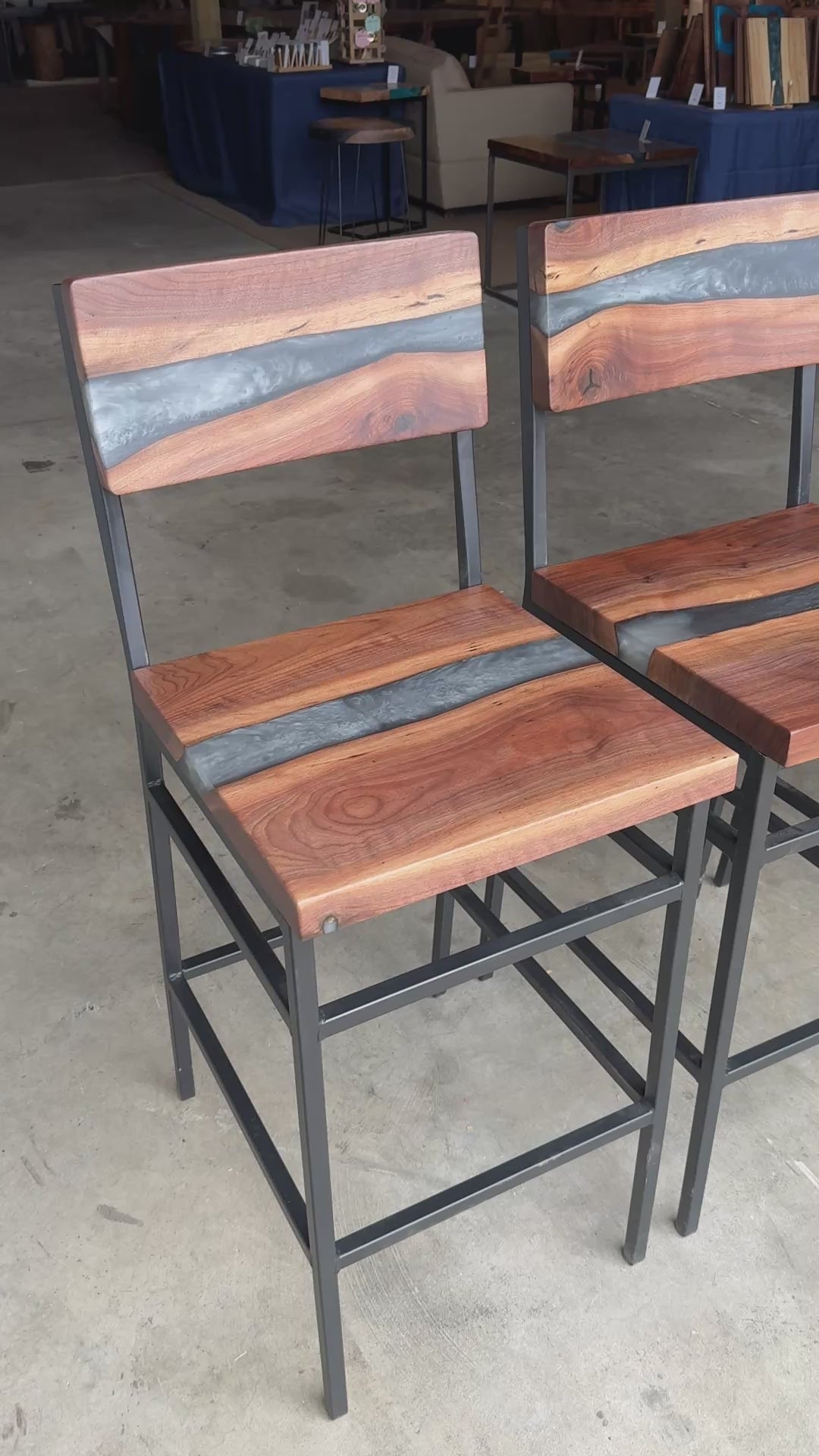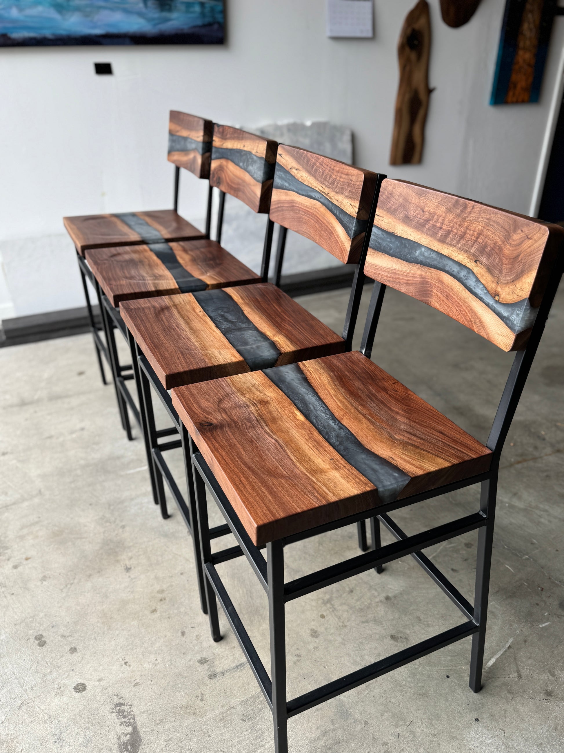 Alongside this production queue, we outsource our legs from local welders. The designs are fabricated and painted as needed, then dropped off at our shop. We align the bolts so that they anchor in the wood and are not seen in the resin, then install the legs securely using as many bolts as will securely hold the table in place. Large or heavy pieces have additional reinforcement to keep the table from bowing, including rails or even a center leg.