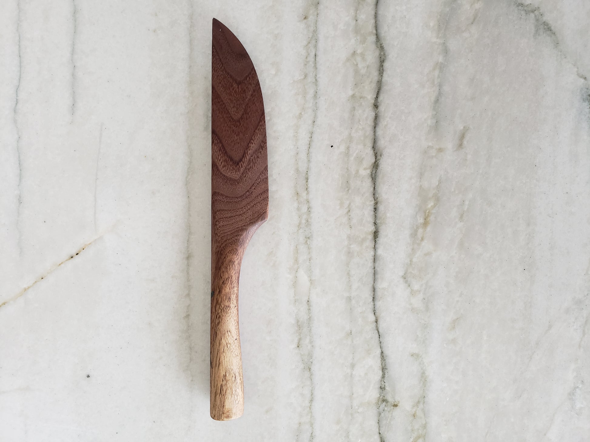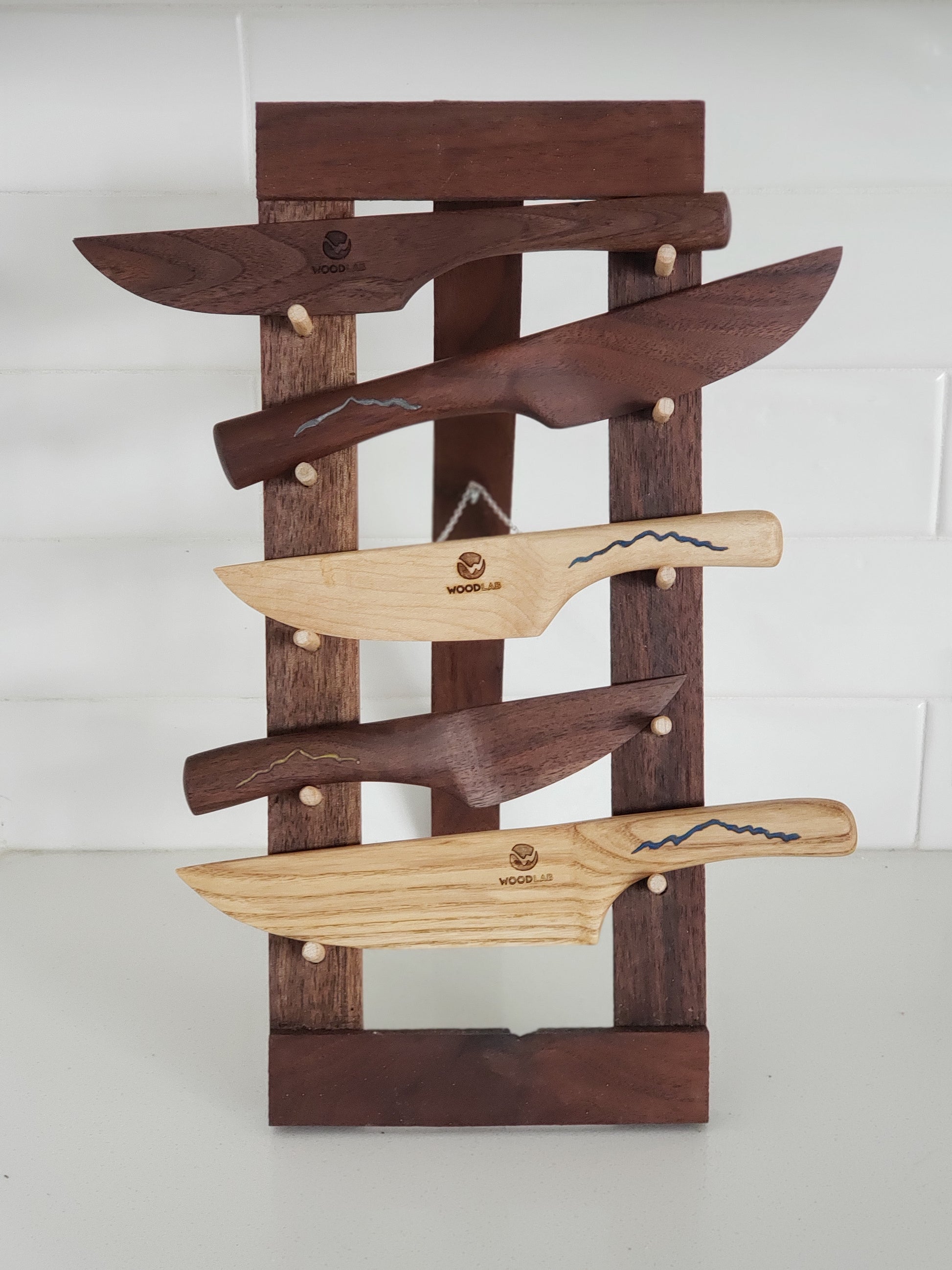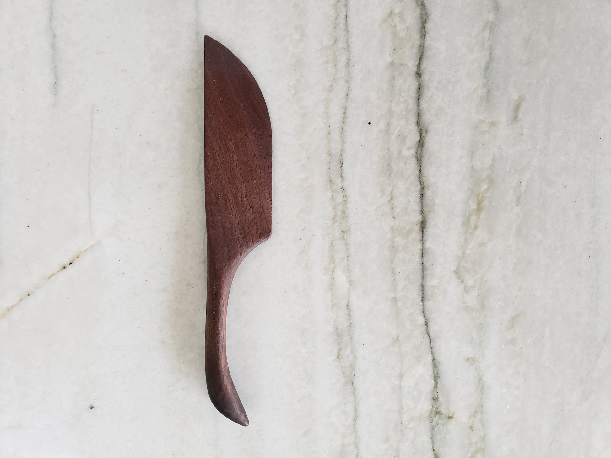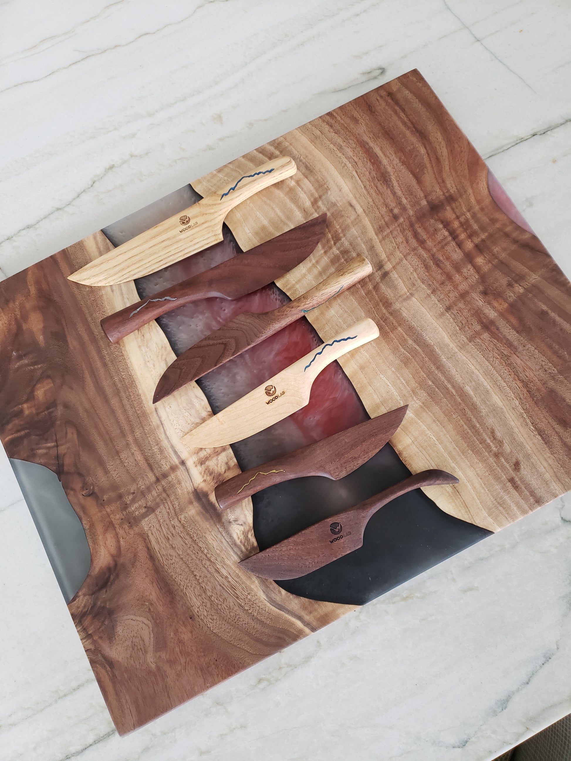 These hand carved solid wood cheese knives make an ideal complement to your WoodLab charcuterie board. Made from local walnut and maple, they feel soft and comfortable in the hand and slice medium to softer cheese with ease. Carefully rounded handles are ultra smooth to the touch.