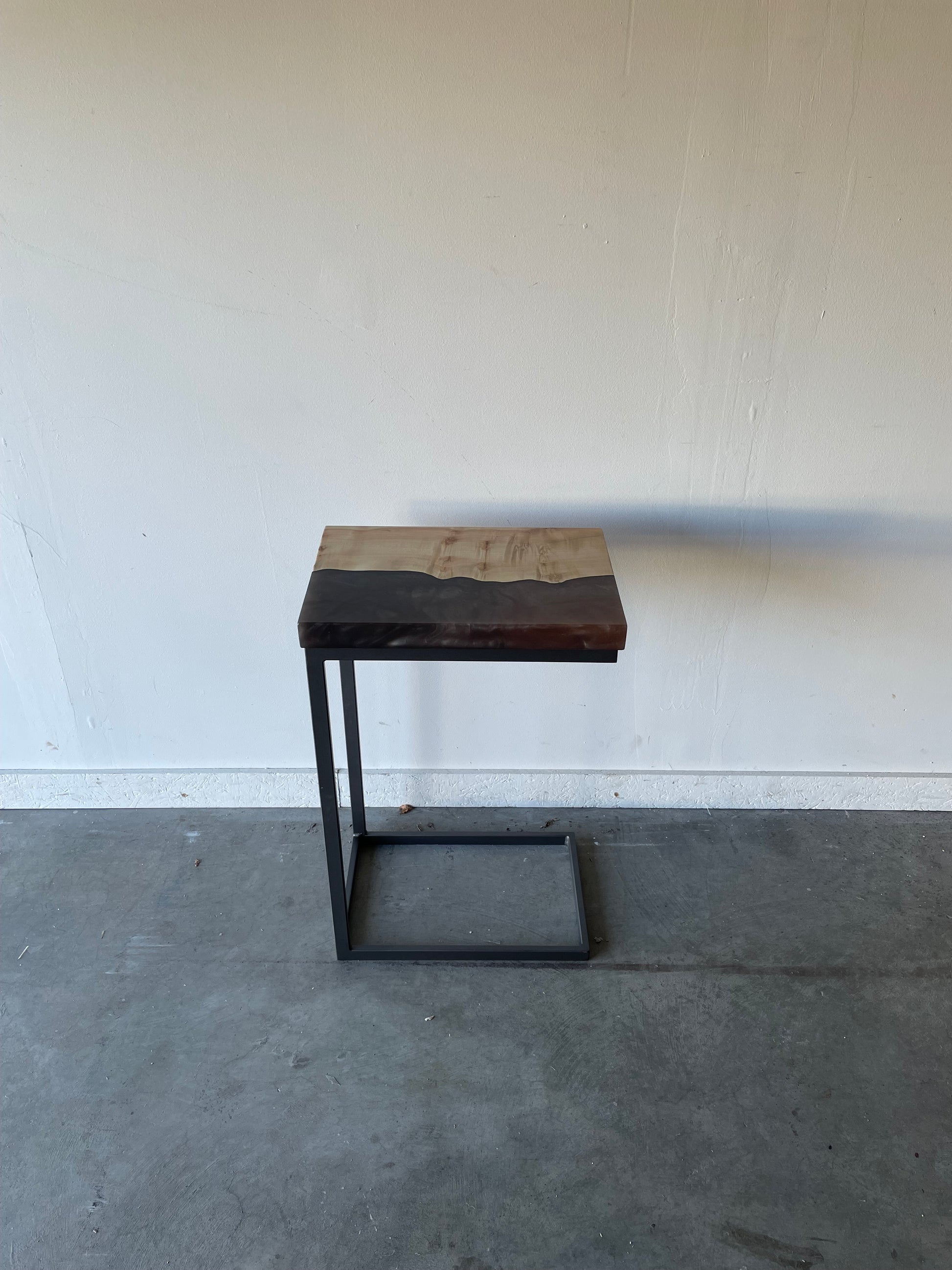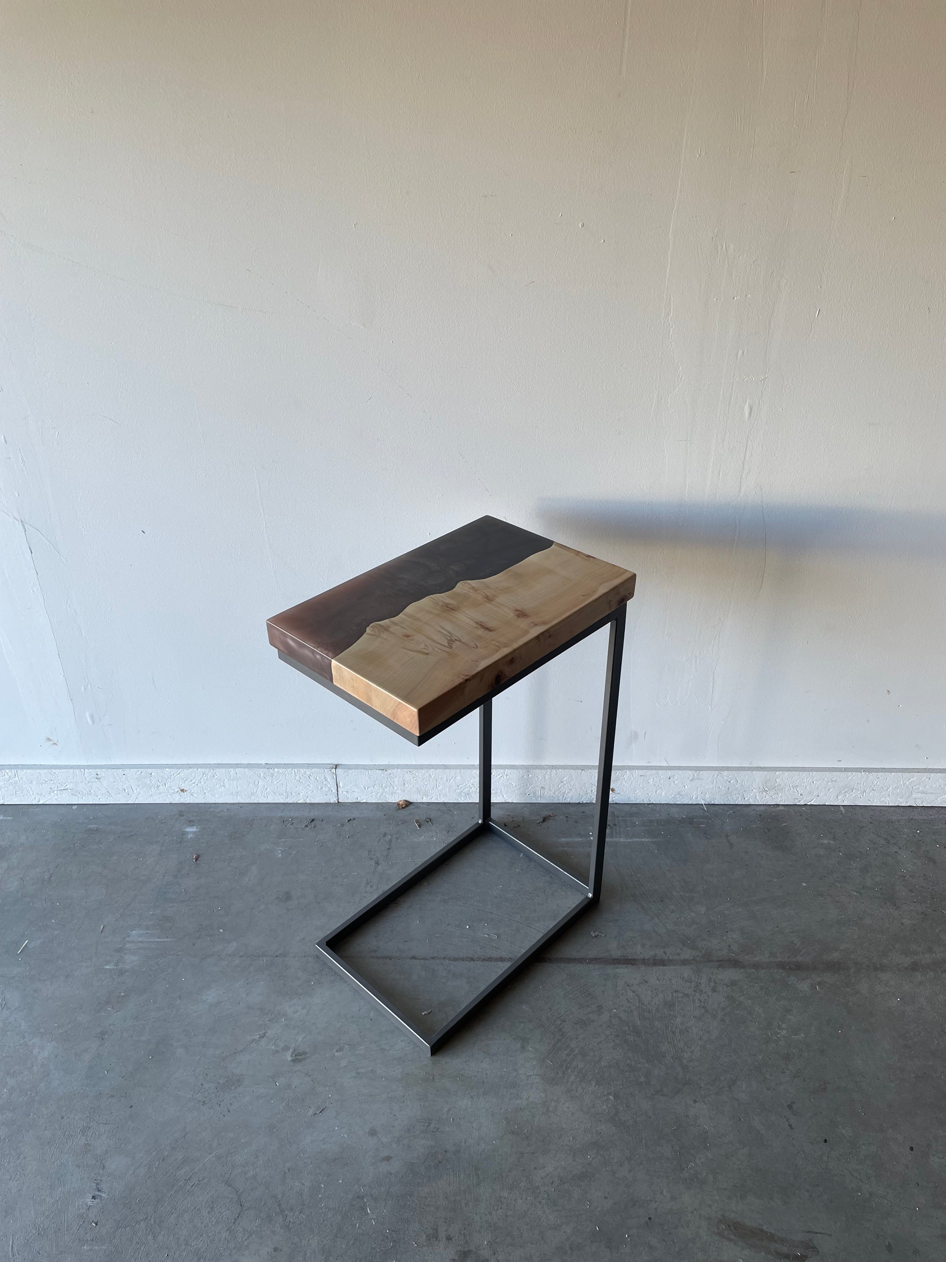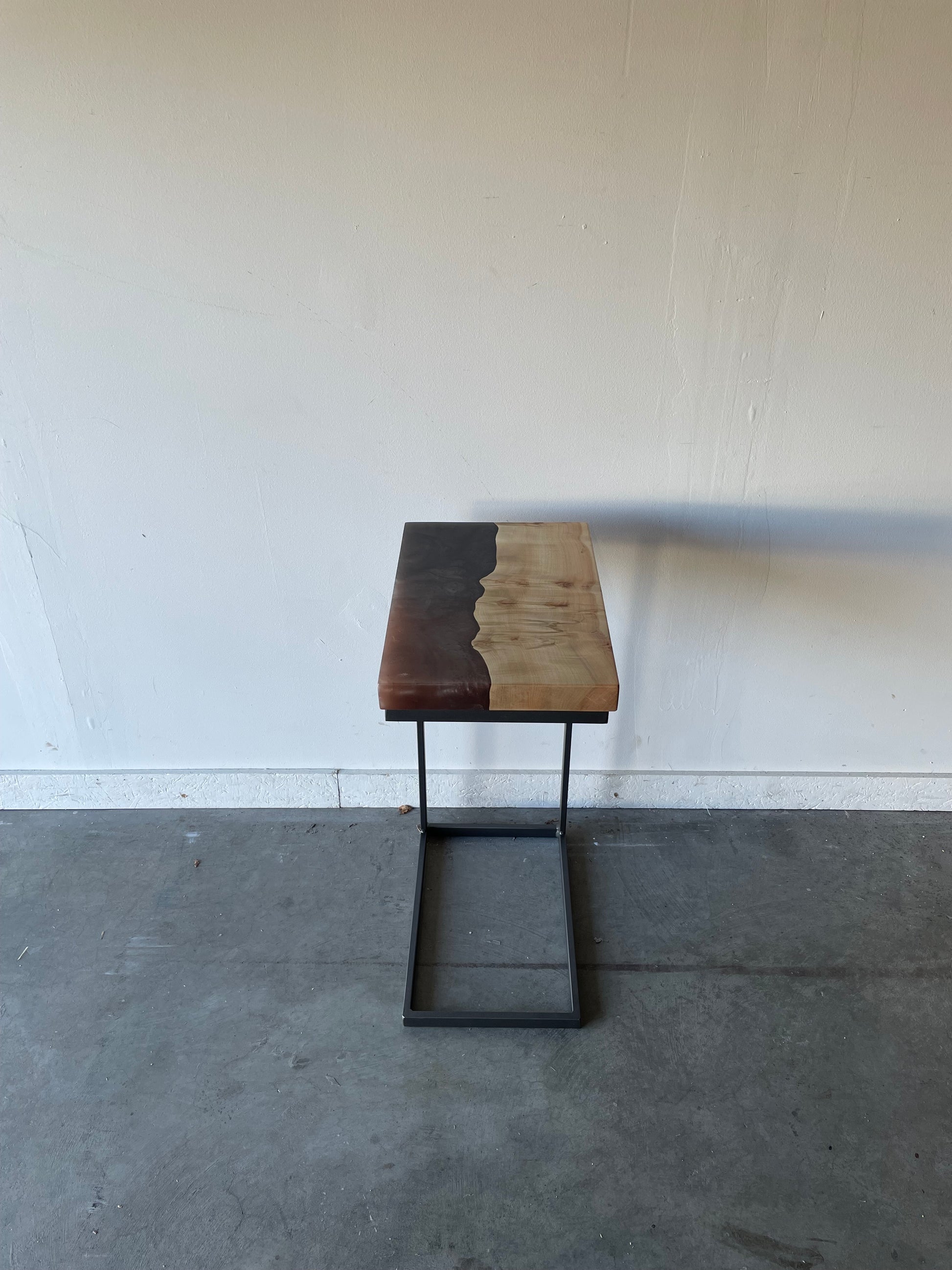 Alongside this production queue, we outsource our legs from local welders. The designs are fabricated and painted as needed, then dropped off at our shop. We align the bolts so that they anchor in the wood and are not seen in the resin, then install the legs securely using as many bolts as will securely hold the table in place. Large or heavy pieces have additional reinforcement to keep the table from bowing, including rails or even a center leg.