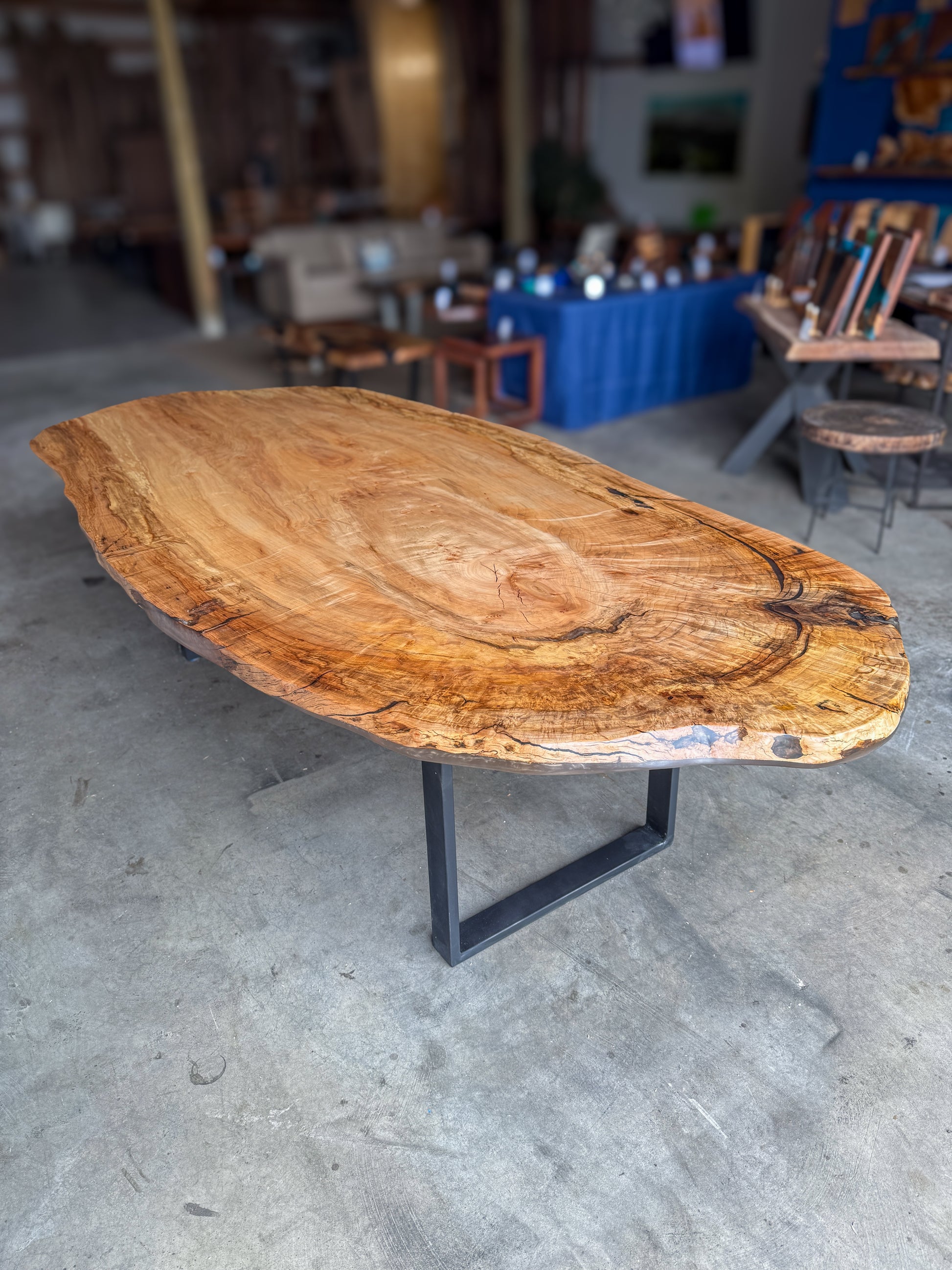 Alongside this production queue, we outsource our legs from local welders. The designs are fabricated and painted as needed, then dropped off at our shop. We align the bolts so that they anchor in the wood and are not seen in the resin, then install the legs securely using as many bolts as will securely hold the table in place. Large or heavy pieces have additional reinforcement to keep the table from bowing, including rails or even a center leg.